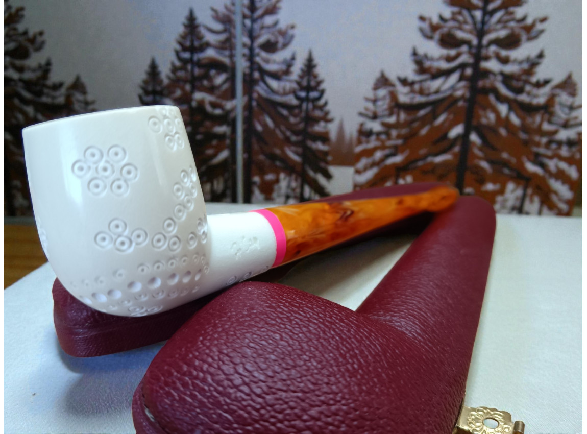 In summary, the Block Meerschaum Amber Rose Pipe seamlessly blends floral artistry, mineral purity, and superb smoking performance. Its sculpted rose motif offers visual elegance; its meerschaum construction ensures cool, clean, and flavorful smoking; its ergonomic design provides comfort; and its evolving patina adds long-term beauty and individuality. Whether displayed as a collectible, smoked regularly, cherished as a symbolic object, or preserved as a future heirloom, the Amber Rose Pipe stands as a refined example of the craftsmanship and emotional resonance possible in traditional meerschaum carving.