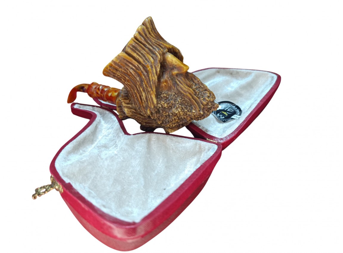 Handle meerschaum carefully. Smoke slowly to season the pipe. Avoid sudden temperature changes and harsh chemicals. Clean with a soft, dry cloth. Over time, the pipe develops a patina that enhances the Tree Man carvings and natural textures.