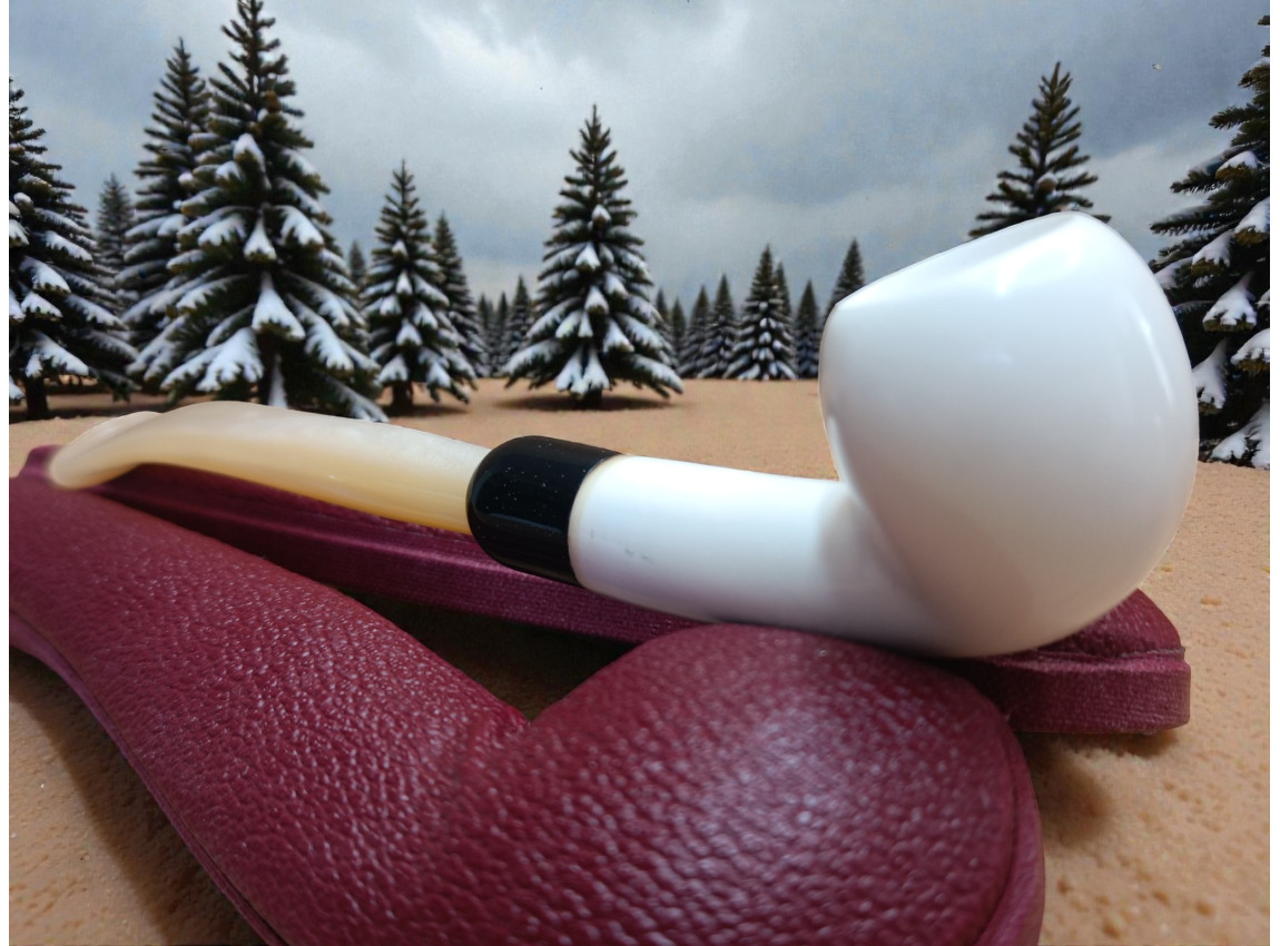 The defining visual feature of the Amber Breeze Pipe is its unique surface coloration. Inspired by the warm tones of sunset light, the coloration blends soft gradients of cream, honey, and amber-like hues, creating a gentle warmth that contrasts beautifully with the bright white of natural meerschaum beneath. This finish enhances the pipe’s contours and gives it a sophisticated, modern elegance that distinguishes it from traditional meerschaum designs. While the coloration enhances the pipe’s visual impact, it does not interfere with the material’s breathability or patina development, allowing the piece to mature naturally over time.