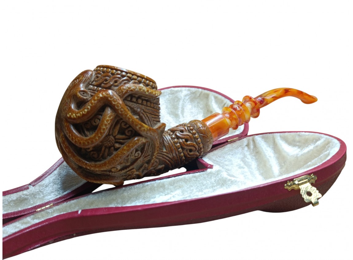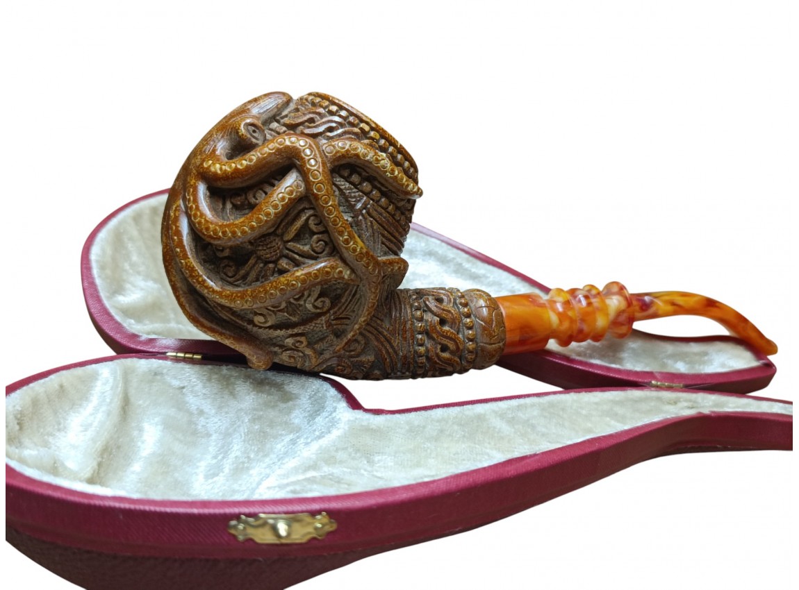This limited-edition, hand-carved pipe is ideal for collectors seeking unique designs. Its underwater inspiration, detailed carving, and functional excellence make it highly desirable. The Octopus Block Meerschaum Pipe is both an artistic treasure and a smoking instrument.