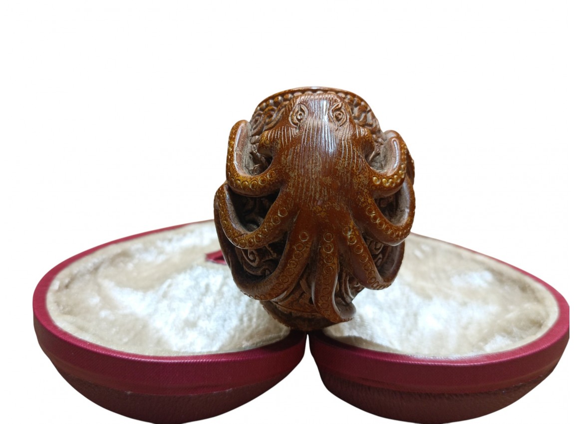 Crafted by the talented artisan H. Çay in collaboration with MeerschaumOnline, this Turkish meerschaum pipe captures the elegance, intelligence, and fluidity of the octopus.